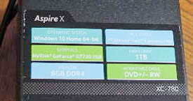 Acer Aspire X (model XC-780), little used (cost €486). The processor is an Intel i5-7400 chip and it has 8gb RAM and a 1tb hard drive. The graphics card is an Nvidia Geforce GT720 with 2gb ram and is running Windows 10 Home 64bit version. It also has a DVD RW and an external wifi card.