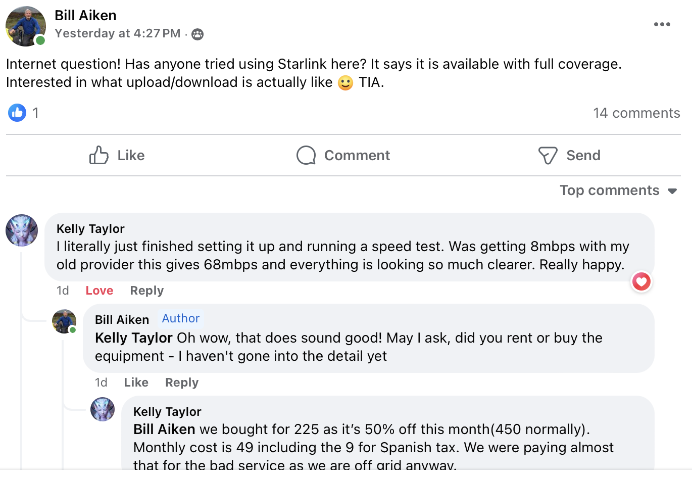 Bill, I've been really tempted to look at it, particularly as the 450e equipment was available free recently, but currently at half price. However, what is holding me back is the absence of some accurate download/upload speeds. The figure I found was 300+. I can get that off a mobile sim card for less than 20e a month, so why would I sign up for a 65e package??
